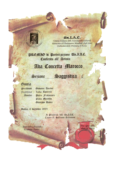 Primo premio ex aequo ad Ada Concetta Marocco di Roma per l'opera "La Sicilia di Pirandello" del grande drammaturgo, autore di portata internazionale, precursore e contemporaneo del "Teatro dell'Assurdo" di Beckett e Jonesco, ritrova i motivi di sicilianità come spesso vengono o troppo evidenziati e spesso ignorati.